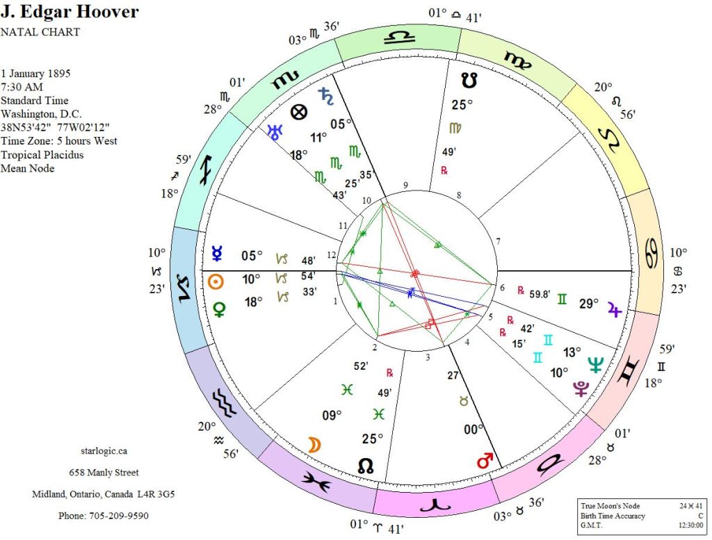 If you couple that doubt with the consistent use of a 7:30 am birth time, you get a very unreal result: birth, just before dawn and a double inconjunct linking Neptune and Pluto with the Sun and the Ascendant. However, if it is correct on both counts, this may help us understand his stubborn attitude AND his need to discover hidden matters, while keeping those secrets. Having Mars in opposition to his Saturn/Midheaven conjunction could also be a very large hint: all actions taken were to maintain control over his Federal Bureau of Investigation.