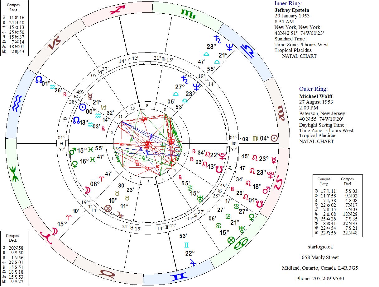 Michael’s North Node is closely conjunct Epstein’s Sun in Aquarius. Their positions of the Moon are just 7° apart in Aries. Michael’s Virgo Sun is in opposition to Epstein’s Pisces Ascendant. I think we have ‘proof’ enough of their links.