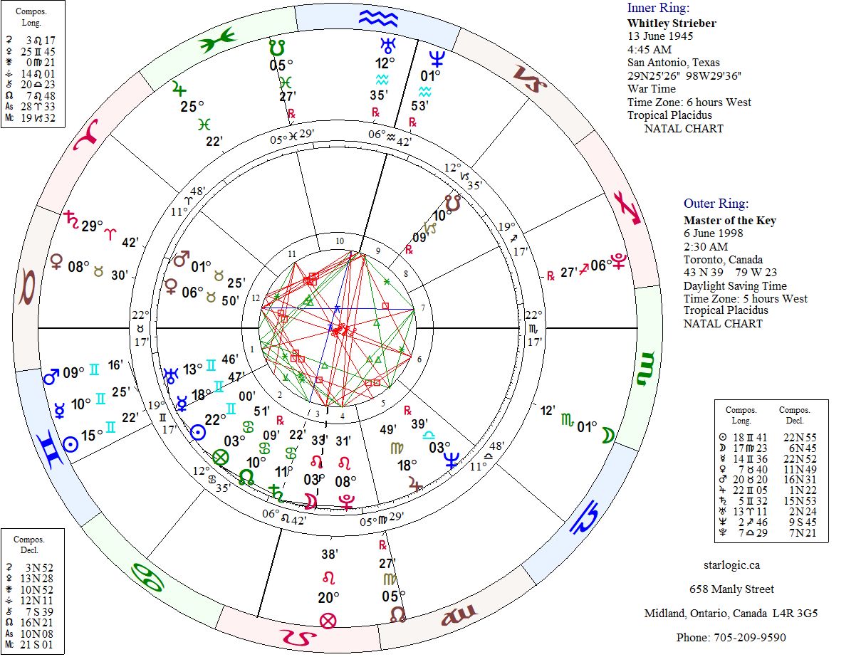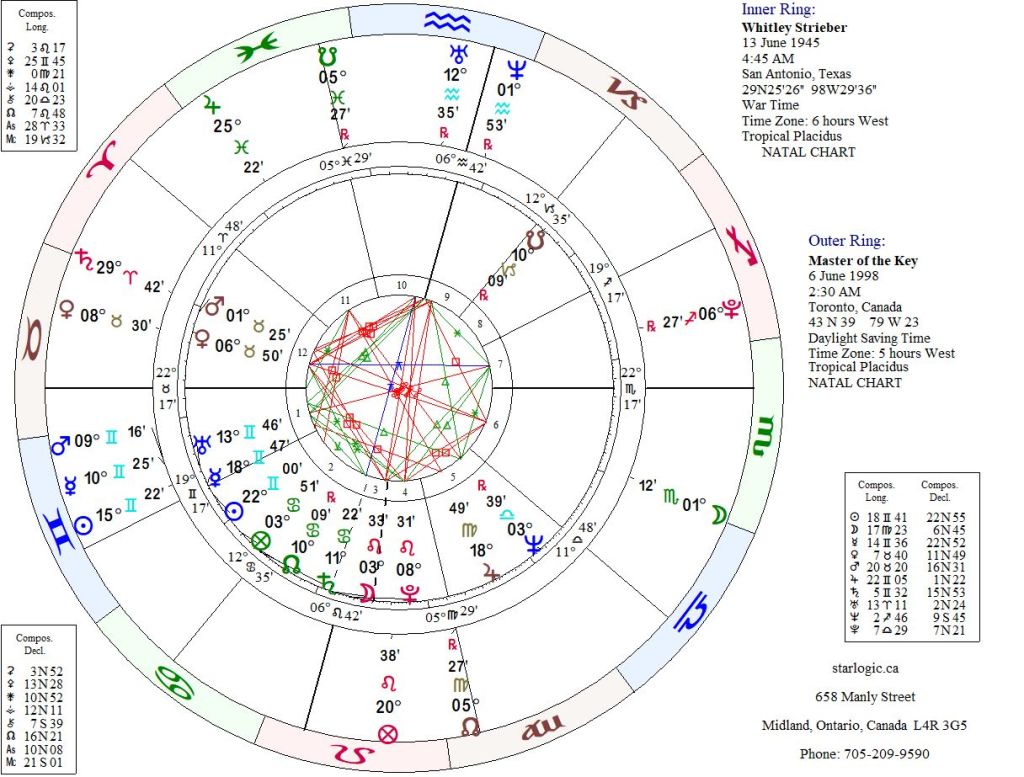 The Key to the whole adventure was that Venus (being conjunct Whitley’s Venus in Taurus) making that inconjunct significant in Whitley’s life. The other interactive inconjunct links Whitley’s Saturn with the event’s Uranus. It seems to me that a small doorway between two different worlds was opened that night.