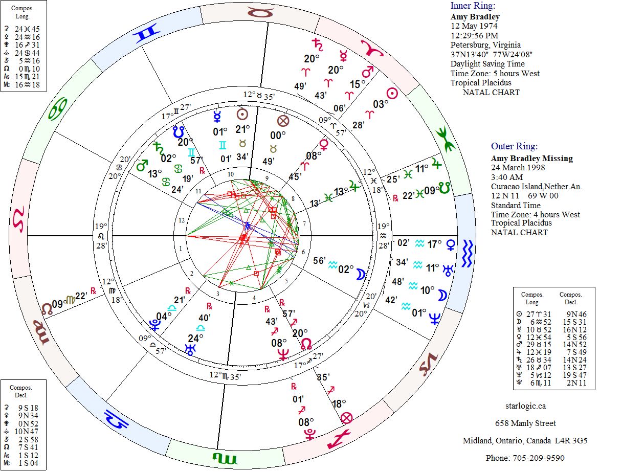 When I first heard about her disappearance (earlier this year), I decided to see if I could compare her birth chart with the “Missing” chart. As her birth time is unknown, I randomized the timing, so I wouldn’t rely too heavily on the placement of the planets in that chart. But it is instructive when compared with the ‘event’ chart.