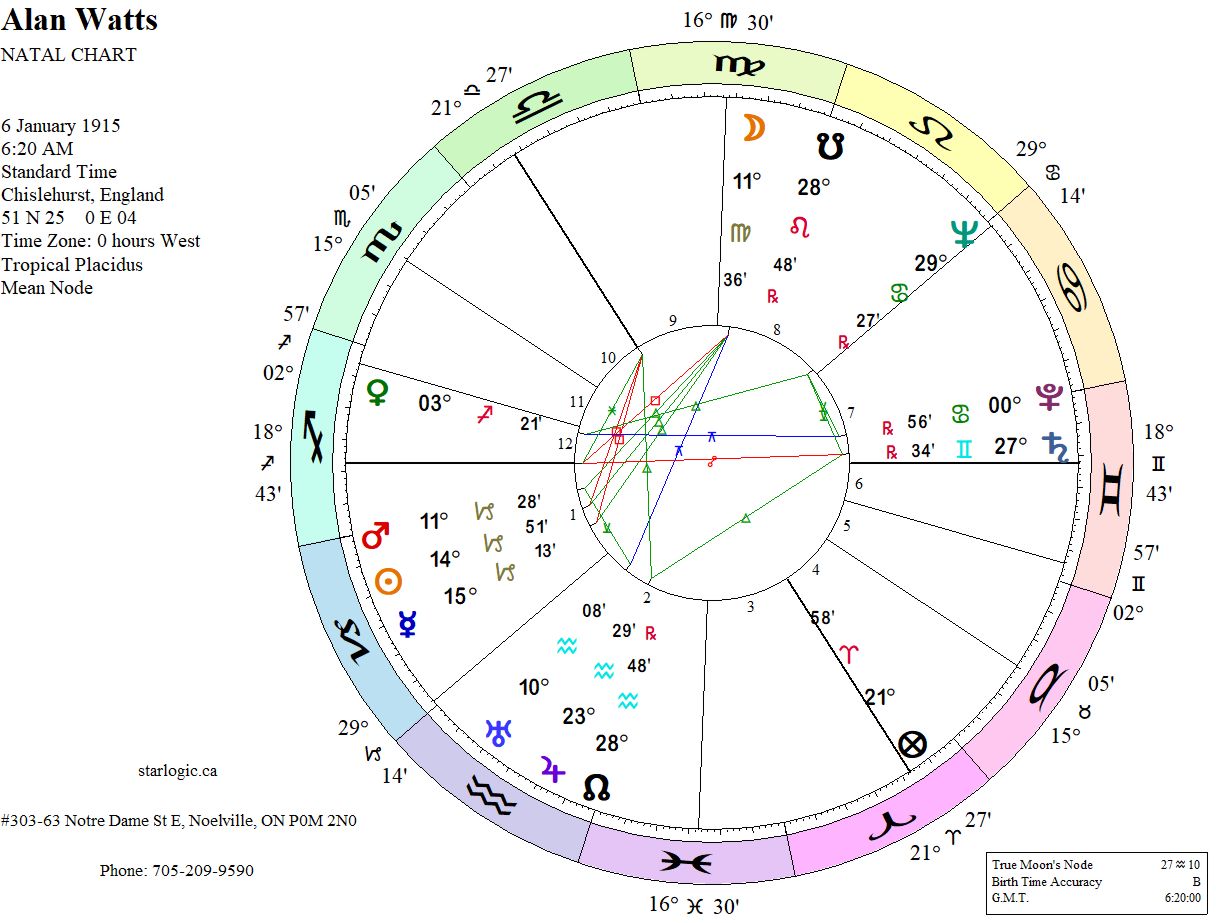 Again, there are two inconjuncts, one linking the Moon and Uranus, the other, Venus and Pluto. I wonder if that’s why he favoured Zen Buddhism, even after becoming a Christian minister.