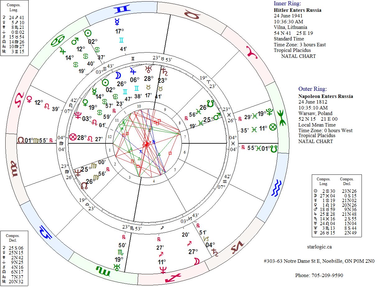 The timings are random, but the events are connected by the Sun sitting @ 2° Cancer. Hitler’s incursion has Mercury conjunct Napoleon’s Jupiter. Napoleon’s action has the North Node within 3° of Hitler’s Ascendant. Maybe there is something to this “coincidence”.