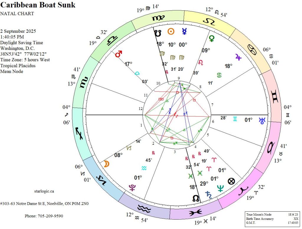 This timing is entirely random, and yet, this demonstrates a Yod (Finger of God) pointing to Mercury, with inconjuncts to a Saturn/Neptune conjunction on one side, and Pluto on the other. And, just for good measure, the Moon is inconjunct Venus. Hmm. This doesn’t surprise me, at all. The Trump Administration will try to argue that black is white, but they won’t succeed.