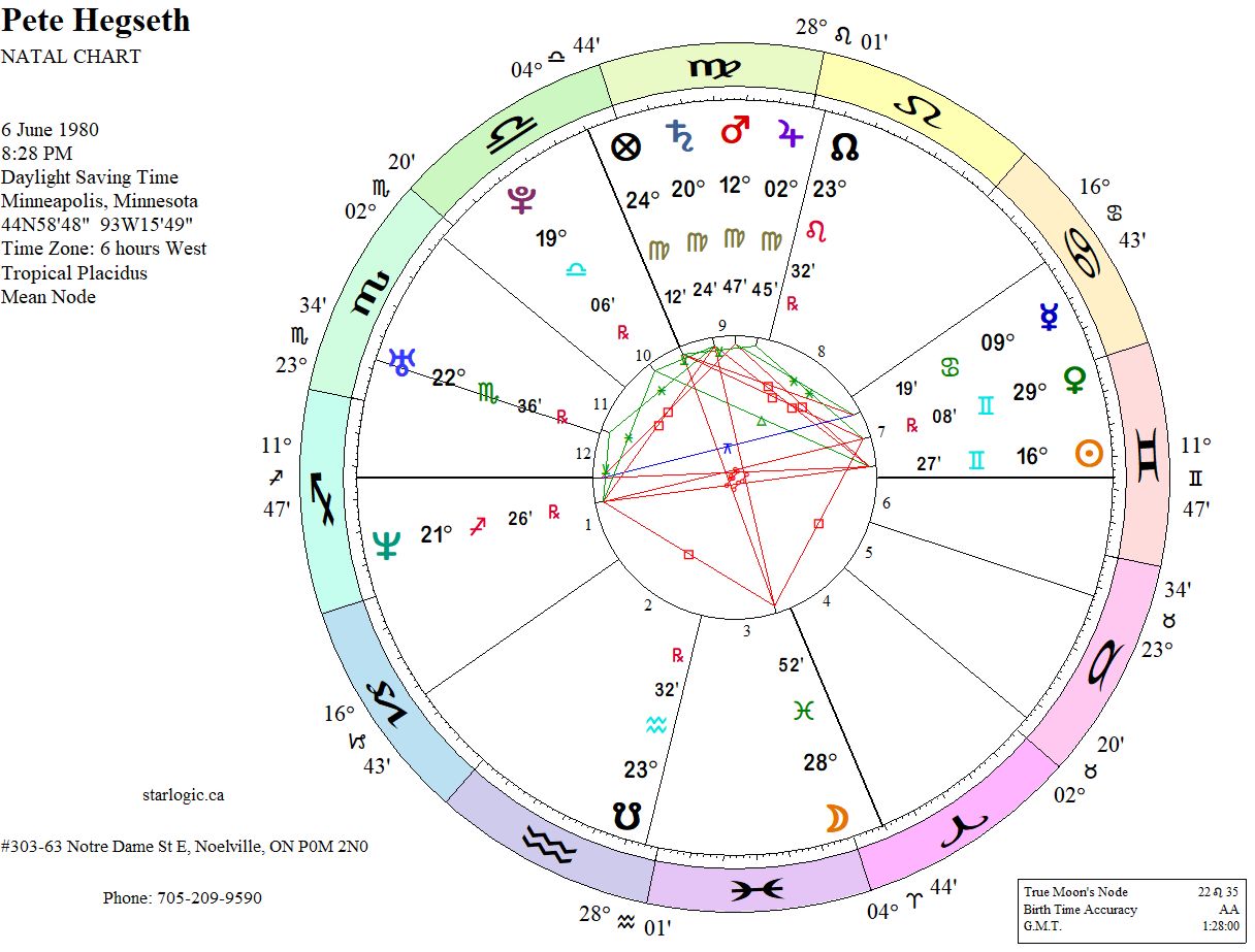 There’s one inconjunct, linking Mercury in the 7th House (of Open Enemies) to his Sagittarius Ascendant. Doesn’t bode well, does it? There’s also a Cosmic Cross linking the Sun opposition Pluto, and the Moon opposition Saturn. That’s quite telling.