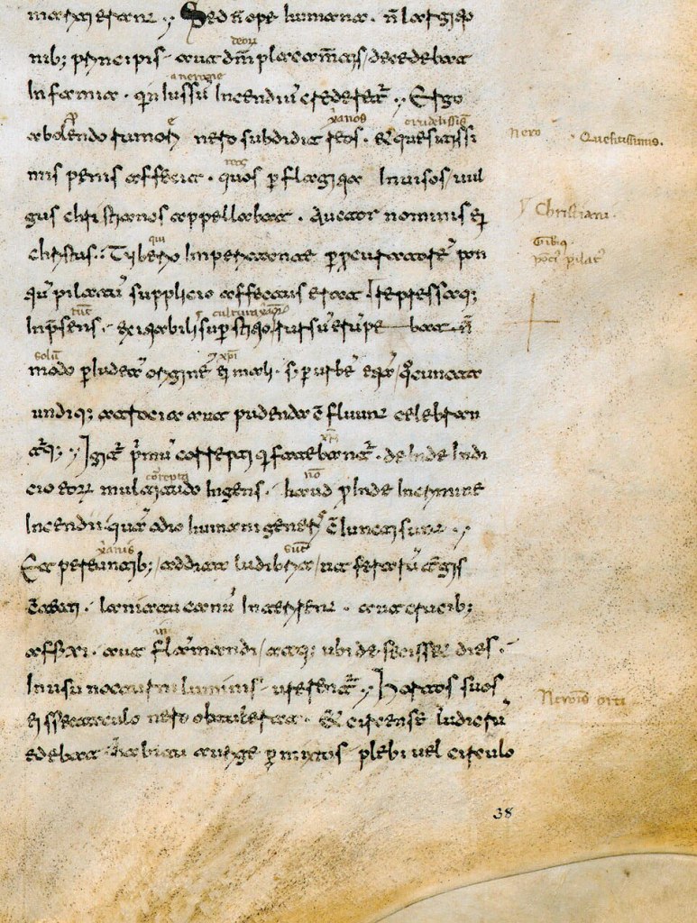 Sed non ope humana, non largitionibus principis aut deum placamentis decedebat infamia, quin iussum incendium crederetur. ergo abolendo rumori Nero subdidit reos et quaesitissimis poenis adfecit, quos per flagitia invisos vulgus Chrestianos appellabat. auctor nominis eius Christus Tibero imperitante per procuratorem Pontium Pilatum supplicio adfectus erat; repressaque in praesens exitiabilis superstitio rursum erumpebat, non modo per Iudaeam, originem eius mali, sed per urbem etiam, quo cuncta undique atrocia aut pudenda confluunt celebranturque. igitur primum correpti qui fatebantur, deinde indicio eorum multitudo ingens haud proinde in crimine incendii quam odio humani generis convicti sunt.