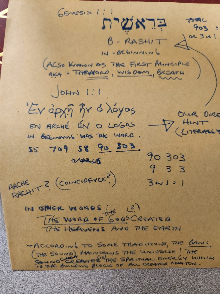 Before I wrote the poem “In-Beginning”, I calculated the value of each letter in Hebrew and Greek to see if they corresponded. I was pleasantly surprised. Of course they’re connected. How could they not be?