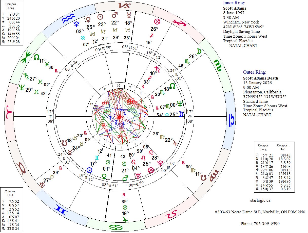 As you can tell by comparing his birth and death charts, Adams was facing a lot of inconjuncts and some of those formed Fingers of God (Yods). Cash Peters posted a YouTube video of Adams’ transition and the symbolism expressed there is significant, at least to me.