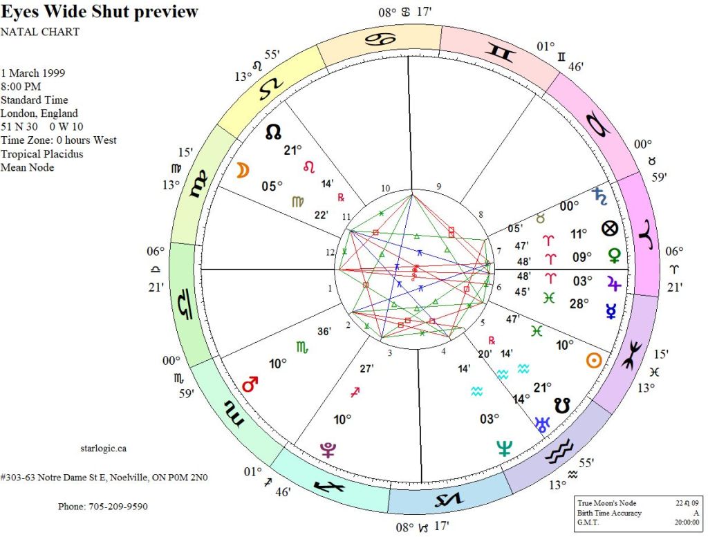 With all the ritual abuse of young women (and girls) being uncovered these days, Kubrick may have been trying to show us that there is a level of the social order that actually worships Satan, or something resembling that. So, to see what the energies were on the day of the preview, I set the time for 8 pm GMT.