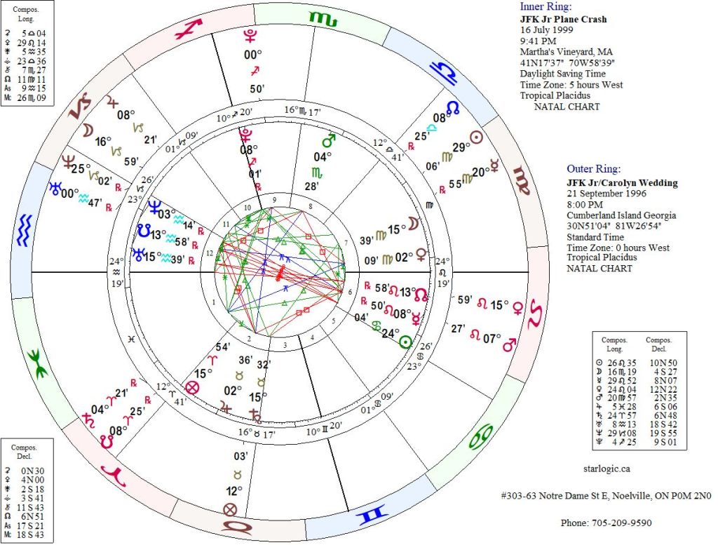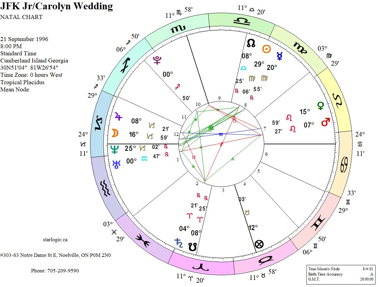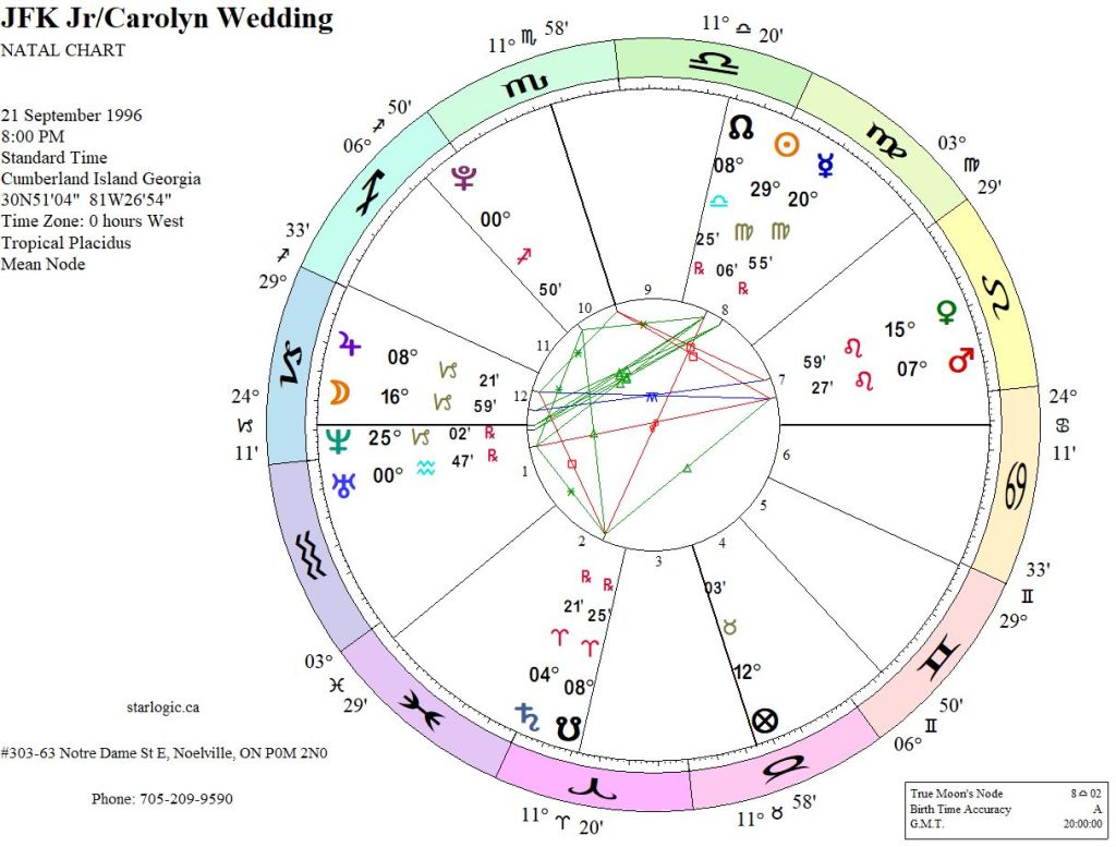 Neptune transiting the Capricorn Ascendant speaks of two things, at the same time: the secrecy involved to effectively hide the event from the paparazzi; and the Kennedy curse which has claimed the lives of so many family members. The Moon is inconjunct Venus, while Mars is inconjunct Jupiter. The Moon and Jupiter are bother in the 12th House (of the Unconscious), and Venus and Mars are in the 7th House (of Open Enemies). The Sun had not yet set by the time they got married, but the chapel had no lighting and the windows were painted white. Those facts also seem symbolic.
