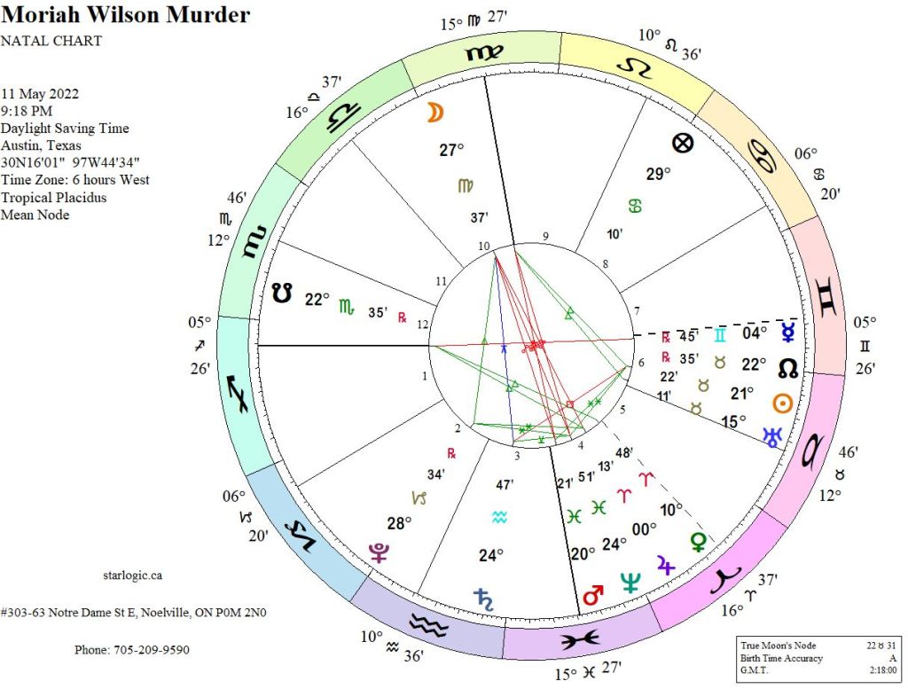 The first two (of three) gunshots occurred at the time of the event chart. In this one, the Moon is inconjunct Saturn. The Moon is pivotal to most of the aspects at the time of the murder: opposition to Mars, Jupiter and Neptune in the 4th House; and trine to Pluto in the 2nd House. These aspects demonstrate the motivations of the killer, Kaitlin Armstrong. Pluto in the 2nd House is fear of loss of money and influence. The trio of planets in the 4th House represent her turbulent home life. Notice that Venus is in that House, too. Venus and Jupiter are trine to the Sagittarius Ascendant, while Mercury is in opposition to the Ascendant. Mars and Neptune are opposite the Midheaven. There are no unaspected planets.