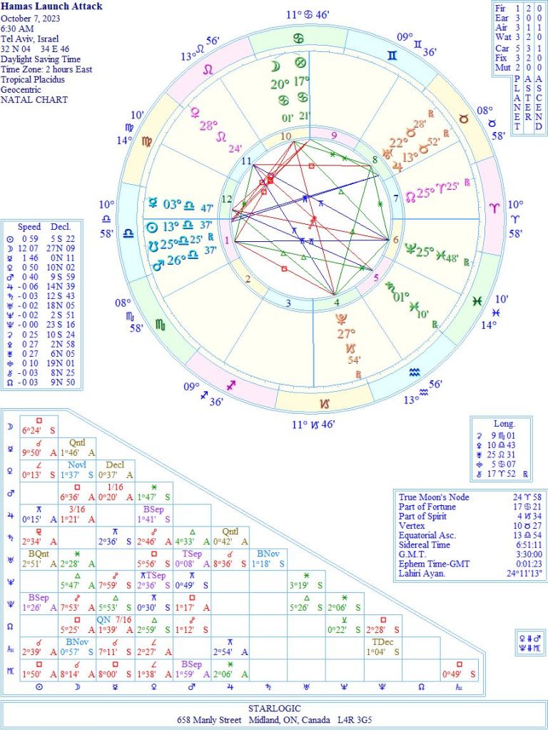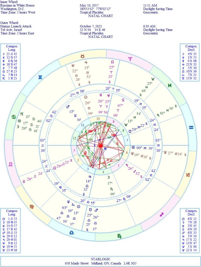 Russian’s Uranus is conjunct Hamas’ North Node; Russian’s Sun is conjunct Hamas’ Uranus; Russian’s Jupiter is conjunct Hamas’ Sun; Russian’s Moon is opposite Hamas’ Jupiter; Russian’s North Node is conjunct Hamas’ Venus; Russian’s South Node is conjunct Hamas’ Saturn; Russian’s Mercury/Uranus conjunction is opposite Hamas’ Mars/South Node conjunction; and finally, Russian’s Part of Fortune is conjunct Hamas’ Pluto. Is that enough proof for you?