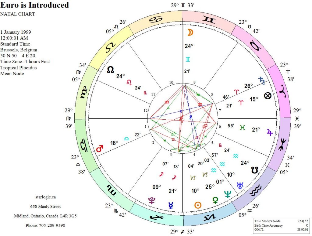 I set the clock for this chart to one second past midnight, Central European Time. Three inconjuncts were operating. These aspects may explain why the EU is a bit hit and miss in political terms.